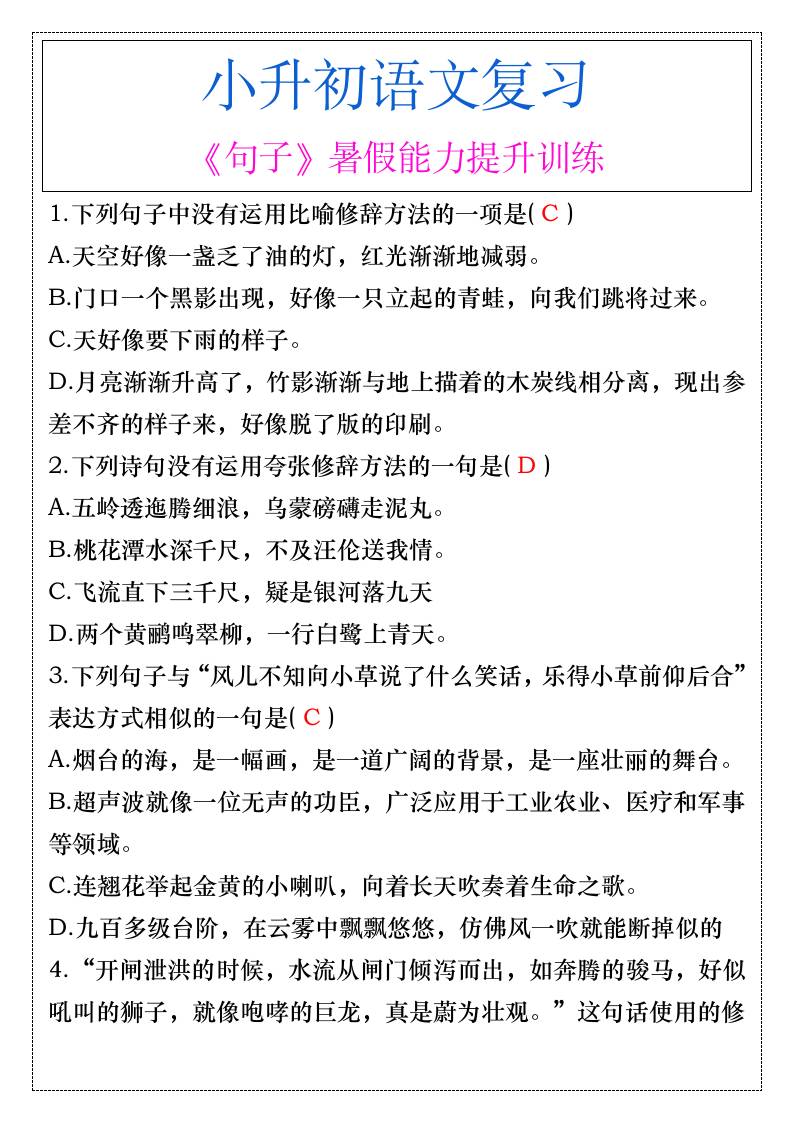 小升初语文《句子》暑假能力提升训练-小升初语文 暑假 幼师酸奶 2025-10-24 小升初 资源下载下载价格0.8 下载币VIP免费升级VIP立即购买 ——预览已结束,还剩2页未读——开通会员后可免费下载高清完整文档 阅读全文