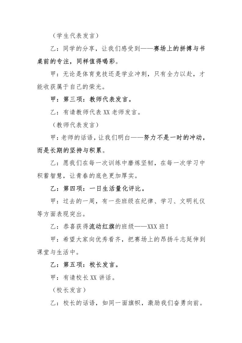 2025年秋季第一学期升旗仪式主持词(21周):第12周秋风将鼓敲赛场,少年挥笔写长歌 综合资料 王赞 2025-10-23 教务 资源下载下载价格1.8 下载币VIP免费升级VIP立即购买 ——预览已结束,还剩1页未读——开通会员后可免费下载高清完整文档 阅读全文